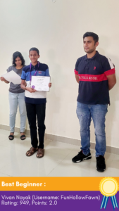 Best Beginner: Vivan Nayak (Username: FunHollowFawn) Rating: 949, Points: 2.0