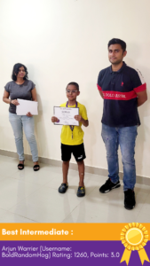 Best Intermediate: Arjun Warrier (Username: BoldRandomHog) Rating: 1260, Points: 3.0